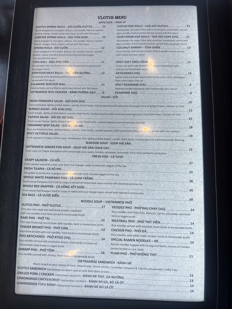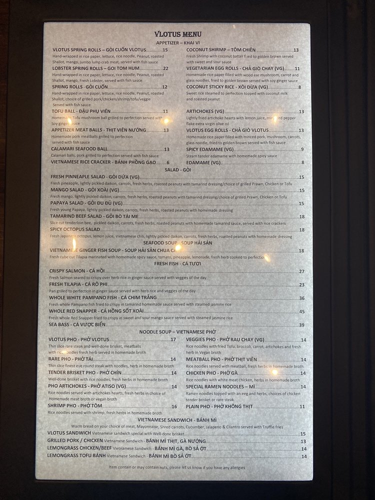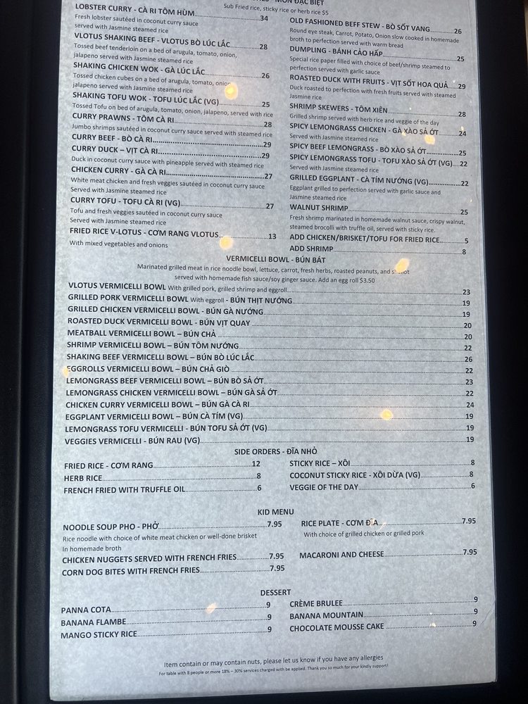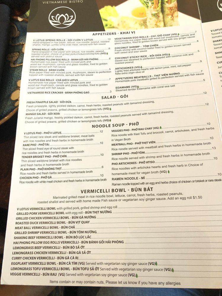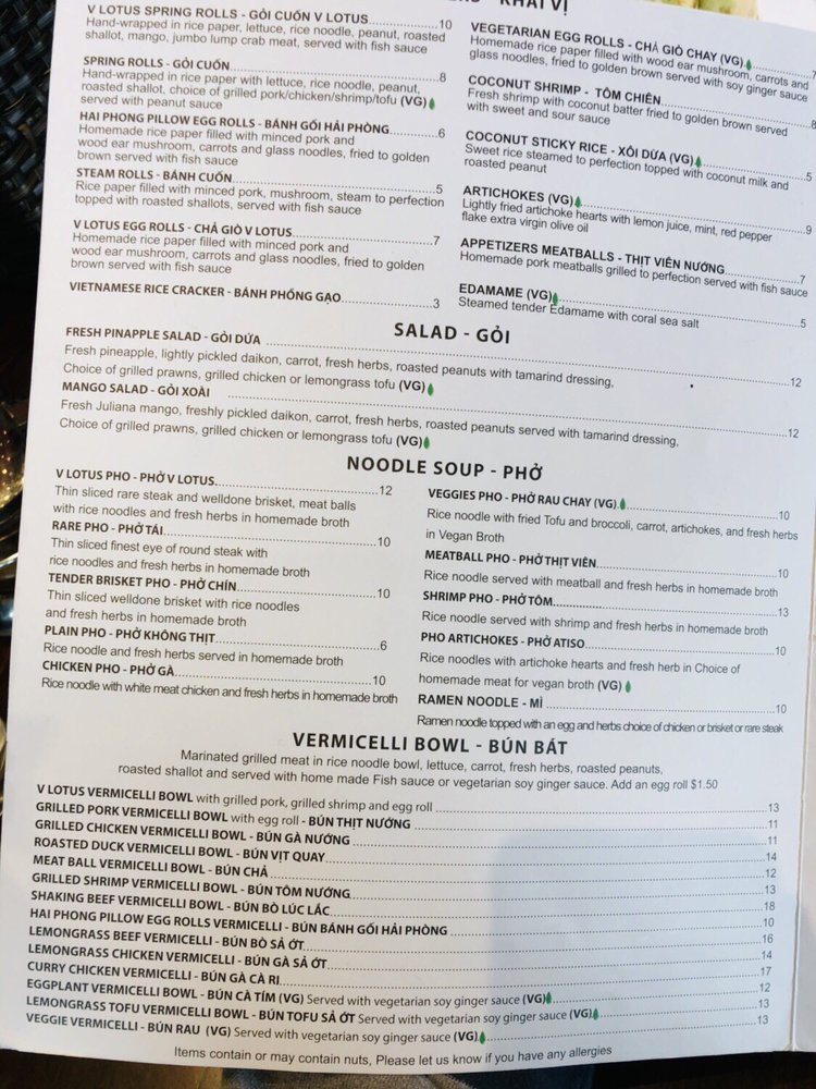 V Lotus is a Vietnamese restaurant that offers a sophisticated dining experience with a range of vegan and vegetarian options. Located in Sugar Land, TX, it features a serene atmosphere with impeccable service. The menu includes delectable dishes like the V Lotus Spring Rolls and the flavorful Pho soup. Customers praise the fresh ingredients and elegant presentation of the dishes. Reviews highlight the attentive staff, upscale ambiance, and unique dessert options like the bay leaf panna cotta and Thai mango sticky rice. Overall, V Lotus provides a modern twist on traditional Vietnamese cuisine, making it a must-visit restaurant for those seeking a high-quality dining experience.